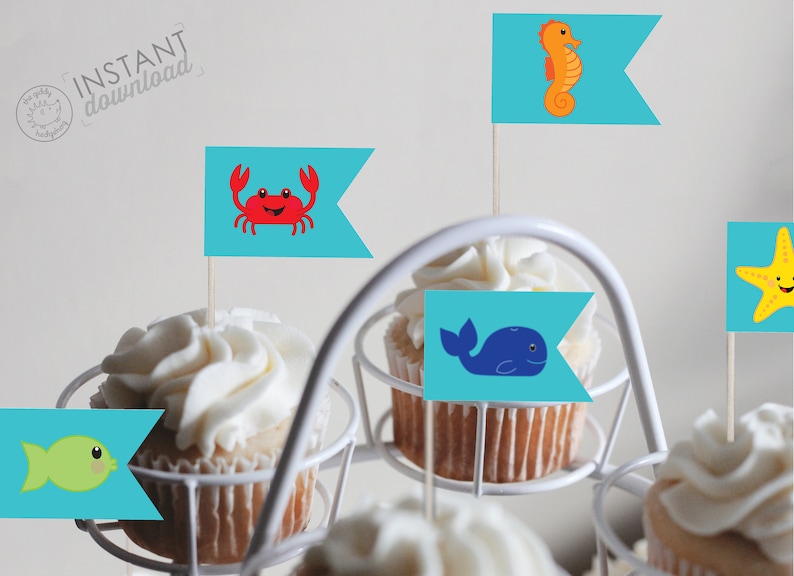 Diy Printable Ocean Cupcake Topper Decorations Cake Pop Sticks Under The Sea Ocean Nautical Baby Shower Decor Whale Cake Toppers Whale Flags